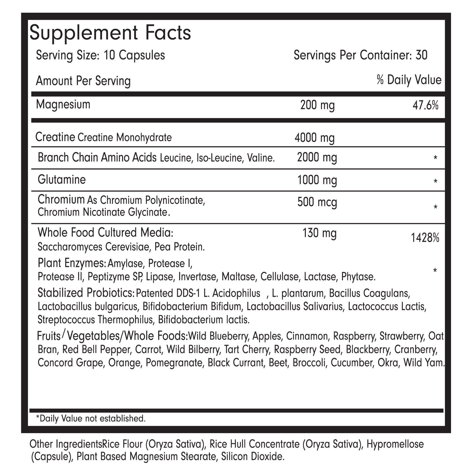 Magnesium, Creatine monohydrate, leucine, iso-lieucine, valine, glutamine, chromium polynicotinate, chromium nicotinate glycinate, saccharomyces cerevisiae, pea protein, amylase, protease I, protease II, peptizyme SP, lipase, invertase, maltase, cellulase, lactase, phytase, patented DDS-1 L. Acidophilus, L. plantarum, bacillus coagulans, lactobacillus bulgaricus, bifidobacterium, bifidum, lactobacillus salivarius, lactococcus lactis, streptococcus thermophilus, bifidobacterium lactis, wild blueberry, apples, cinnamon, raspberry, strawberry, oat bran, red bell pepper, carrot, wild bilberry, tart cherry, raspberry seed, blackberry, cranberry, concord grape, orange, pomegranate, black currant, beet, broccoli, cucumber, okra, wild yam.