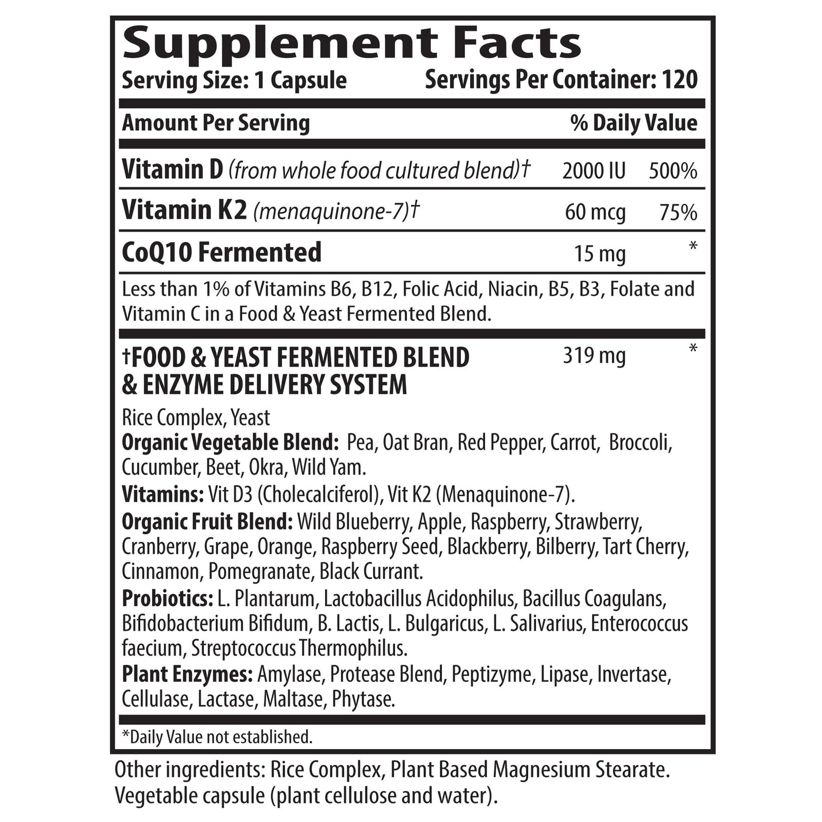 Vitamin D, Vitamin K2 (menaquinone-7), CoQ10 fermented, Vitamin B6, Vitamin B12, folic acid, Niacin, Vitamin B5, Vitamin B3, Folate, Vitamin C, rice complex, yeast, pea, oat bran, red pepper, carrot, broccoli, cucumber, beet, okra, wild yam, Vitamin D3 (Cholecalciferol), wild blueberry, apple, raspberry, strawberry, cranberry, grape, orange, raspberry seed, blackberry, bilberry, tart cherry, cinnamon, pomegranate, black currant, L. Plantarum, Lactobacillus Acidophilus, Bacillus Coagulans, Bifidobacterium Bifidum, B. Lactis, L. Bulgaricus, L. Salivarius, Enterococcus faecium, Streptococcus Thermophilus, Amalyse, Protease blend, Peptizyme, Lipase, Invertase, Cellulase, Lactase, Maltase, Phytase, plant-based magnesium stearate, plant cellulose, water
