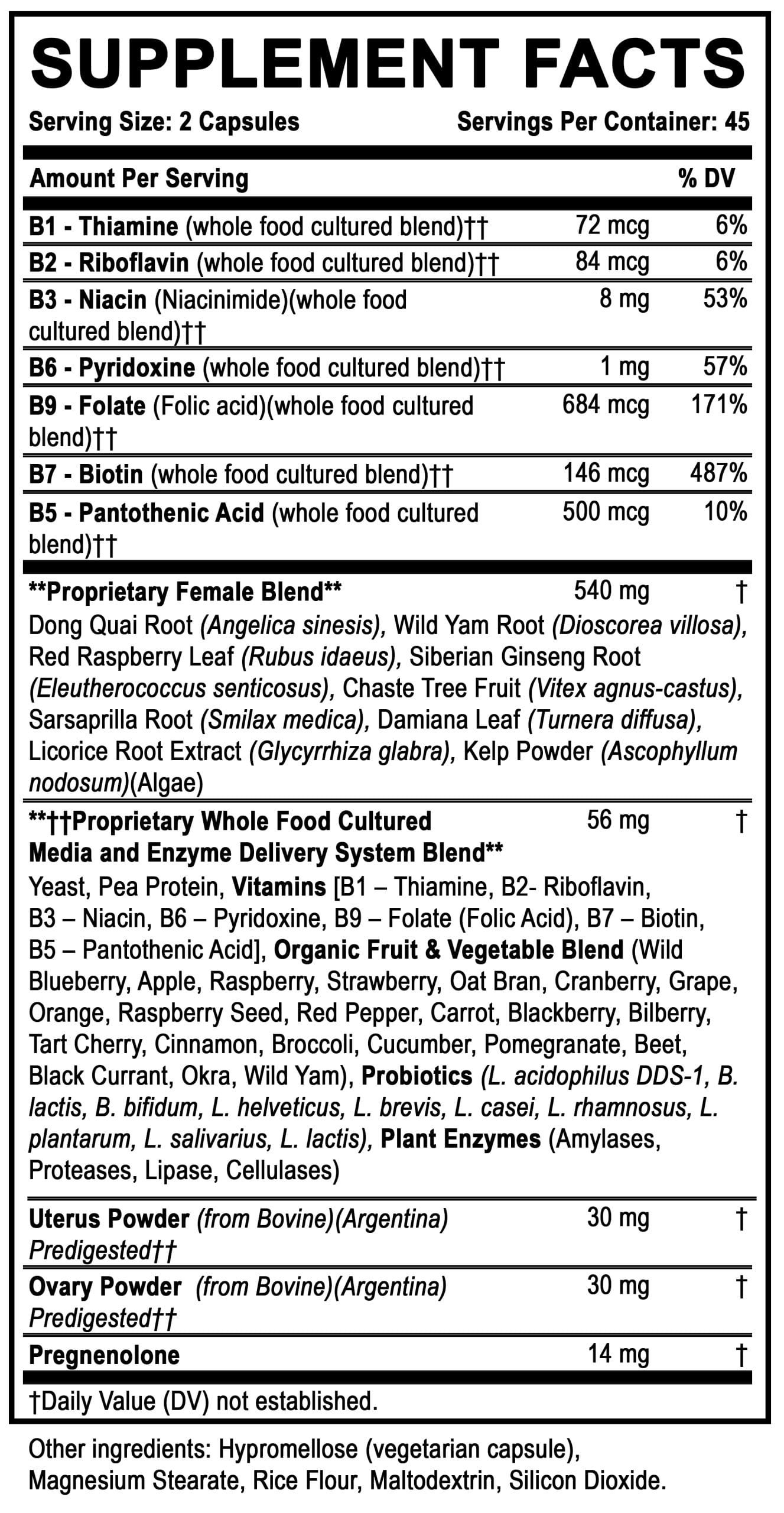 | Content | Women’s Support is a carefully blended formula full of vitamins, herbs, fruits, and vegetables specifically chosen to help women, and is designed to support you through all phases of your adult female life. Whether you are pregnant, a young adult, or aging gracefully, you can benefit from our supplement designed for women. INGREDIENTS LISTPROPRIETARY FEMALE BLEND: Dong Quai Root (Angelica sinesis), Wild Yam Root (Dioscorea villosa), Red Raspberry Leaf (Rubus idaeus), Siberian Ginseng Root (Eleutherococcus senticosus), Chaste Tree Fruit (Vitex agnus-castus), Sarsaprilla Root (Smilax medica), Damiana Leaf (Turnera diffusa), Licorice Root Extract (Glycyrrhiza glabra), Kelp Powder (Ascophyllum nodosum)(Algae), Proprietary Whole Food Cultured Media and Enzyme Delivery System Blend, Yeast, Pea Protein, Vitamins [B1 – Thiamine, B2- Riboflavin, B3 – Niacin, B6 – Pyridoxine, B9 – Folate (Folic Acid), B7 – Biotin, B5 – Pantothenic Acid], Organic Fruit & Vegetable Blend (Wild Blueberry, Apple, Raspberry, Strawberry, Oat Bran, Cranberry, Grape, Orange, Raspberry Seed, Red Pepper, Carrot, Blackberry, Bilberry, Tart Cherry, Cinnamon, Broccoli, Cucumber, Pomegranate, Beet, Black Currant, Okra, Wild Yam), Probiotics (L. acidophilus DDS-1, B. lactis, B. bifidum, L. helveticus, L. brevis, L. casei, L. rhamnosus, L. plantarum, L. salivarius, L. lactis), Plant Enzymes (Amylases, Proteases, Lipase, Cellulases), Uterus Powder (from Bovine)(Argentina) Predigested, Ovary Powder (from Bovine)(Argentina) Predigested, Pregnenolone, Hypromellose (vegetarian capsule), Magnesium Stearate, Rice Flour, Maltodextrin, Silicon Dioxide. QUANTITYThis listing is for ONE bottle of Women’s Support. IMPORTANT NOTESEach ingredient is chosen for its benefits, including but not limited to: helping hormone balance, reducing the risk of birth defects, supporting fetal development, and boosting energy during pregnancy and breastfeeding. GOOD TO KNOWPlease be aware of ingredients/allergens that could affect you. We also use other ingredients/possible allergens in our facility. There is always a possibility that outside ingredients and finished products have come in contact with this product. Please reach out if you have any concerns or questions. | It's easy to enhance your overall health and wellness with Digestive Nutrients. This supplement is made to give you all the nutrients and vitamins you may be missing from your meals. Digestive Nutrients act as a source of vitamins and minerals and also a source of extra nutrition to support your body's response to stress. INGREDIENTS LISTAcerola cherries, grape seed, grape skin, pine bark extract QUANTITYThis listing is for ONE bottle of Digestive Nutrients. IMPORTANT NOTESEach ingredient was chosen for its benefits, including but not limited to: providing a source of vitamins and minerals, antioxidant support, supporting the body's balanced response to stress, boosting phytonutrient intake, supporting cellular function, supporting the breakdown of foods, better absorption of minerals, and additional nutritional support. GOOD TO KNOWPlease be aware of ingredients/allergens that could affect you. We also use other ingredients/possible allergens in our facility. There is always a possibility that outside ingredients and finished products have come in contact with this product. Please reach out if you have any concerns or questions. | Bones are made up of a hard outer shell and a spongy center core. They are constantly repairing themselves and making new bone cells to replace the old ones, but this process slows as we age. Ostivone Ipriflavone blended with patented amino acid chelated calcium and magnesium included in Bone Essentials are an excellent way to support healthy bone density. INGREDIENTS LISTCalcium, Zinc, copper, manganese, yeast, pea, oat bran, red pepper, carrot, broccoli, cucumber, beet, okra, wild yam, amylase, protease blend, Peptizyme SP, lipase, invertase, cellulase, lactase, maltase, phytase, molasses, wild blueberry, apple, raspberry, strawberry, cranberry, grape, orange, raspberry seed, blackberry, bilberry, tart cherry, cinnamon, pomegranate, black currant, L. Plantarum, lactobacillus acidophilus, bacillus coagulans, bifidobacterium bifidum, B. Lactis, L. Bulgaricus, L. Salvarius, Enterococcus faecium, Streptococcus thermophilus, rice complex, pant based magnesium stearate, plant cellulose, water QUANTITYThis listing is for ONE bottle of Bone Essentials. IMPORTANT NOTESEach ingredient is chosen for its benefits, including but not limited to: promoting healthy bone density, preventing bone loss, and high absorption rate. GOOD TO KNOWPlease be aware of ingredients/allergens that could affect you. We also use other ingredients/possible allergens in our facility. There is always a possibility that outside ingredients and finished products have come in contact with this product. Please reach out if you have any concerns or questions. | Lab-made vitamin C made with isolated ascorbic acid is not the same as food-based vitamin C. Nature’s Vitamin C is chewable and contains vitamin C from real food, like acerola cherries, black currants, oranges, and grapefruit. It also has citrus bioflavonoids, a natural vitamin C with phytonutrients. INGREDIENTS LISTVitamin C (from Acerola cherry fruit), black currant fruit, orange fruit, grapefruit juice, citrus bioflavonoids. QUANTITYThis listing is for ONE bottle of Nature’s Vitamin C. IMPORTANT NOTESEach ingredient was picked based on what it can do for you, including but not limited to: healthy immune support, connective tissue health, and aiding in the body's iron absorption. GOOD TO KNOWPlease be aware of ingredients/allergens that could affect you. We also use other ingredients/possible allergens in our facility. There is always a possibility that outside ingredients and finished products have come in contact with this product. Please reach out if you have any concerns or questions. | Lion's mane mushroom