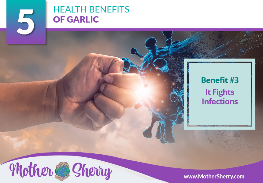 Garlic is a potent natural antibiotic that may aid in the treatment of infections. It fights a wide range of illnesses, including the common cold, flu, and even HIV. Garlic is also antiseptic.